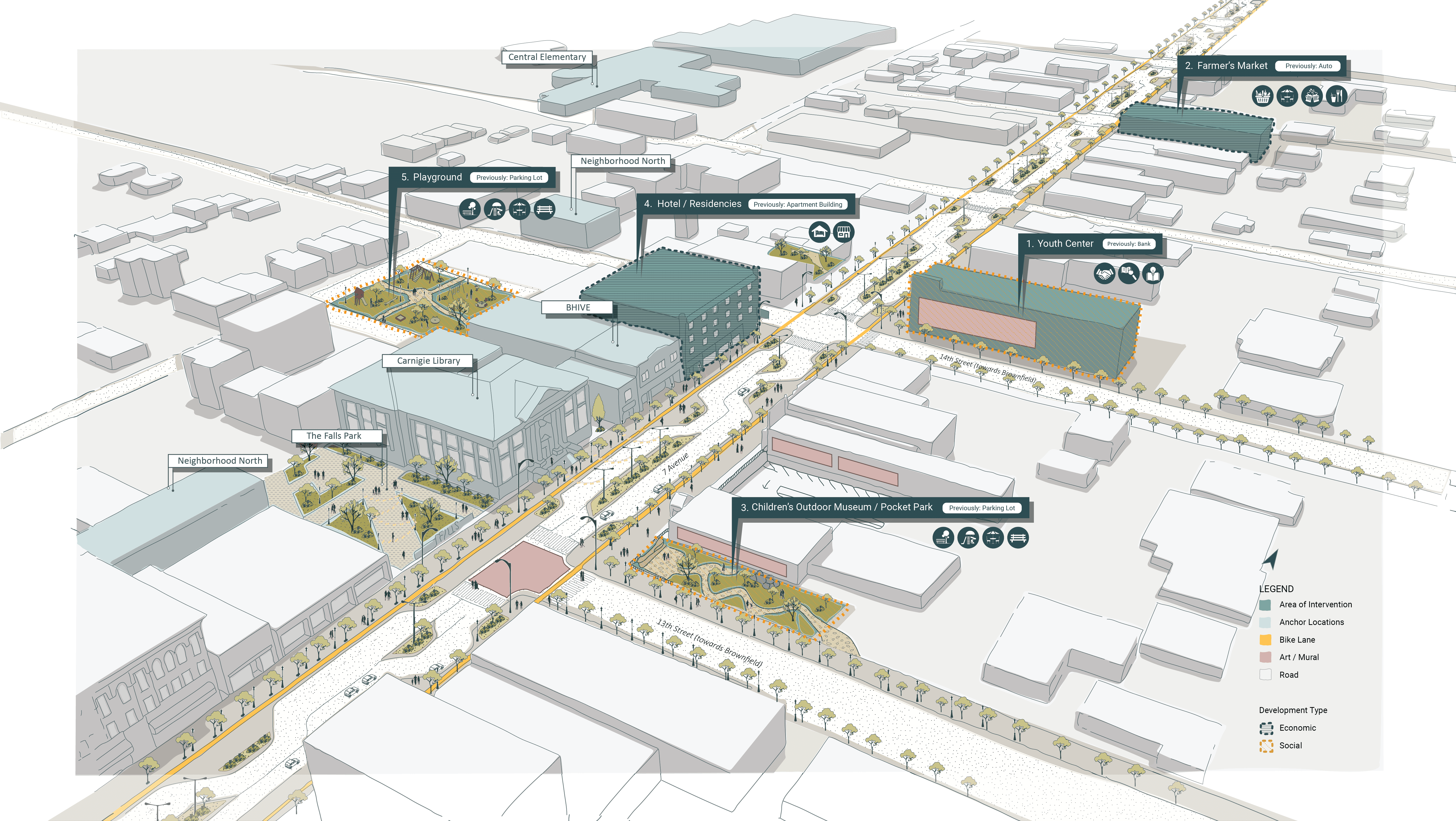 The project will establish Beaver Falls as a talent attraction and retention catalyst through a diverse local economy generated by education- and business-oriented development, which will be supported by a vibrant public realm design. We hope both short-term and long-term interventions will bring vibrancy and investment into the community and it could be the first step towards steady economic, cultural, and urban growth in Beaver Falls. With careful planning and collaborative action, we aim to create spaces that empower residents to feel proud of where they live and to see themselves as essential contributors to their community’s story.